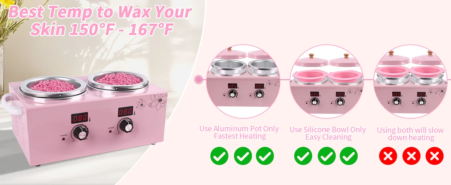 Dual Pots Independent Heating : The double pots design allows you to melt different types of wax simultaneously, such as wax beans, canned wax, wax cakes and wax cubes. Each wax pot has separate temperature control, so you can customize heat settings for optimal results—no more waiting or cross-contamination