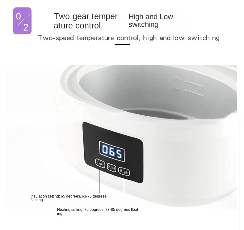 Heating structure: heating coil (bottom heating)Temperature adjustment: touch button (control board intelligent temperature control / constant temperature)Inner pot: Teflon coated aluminum pot (3400ML)